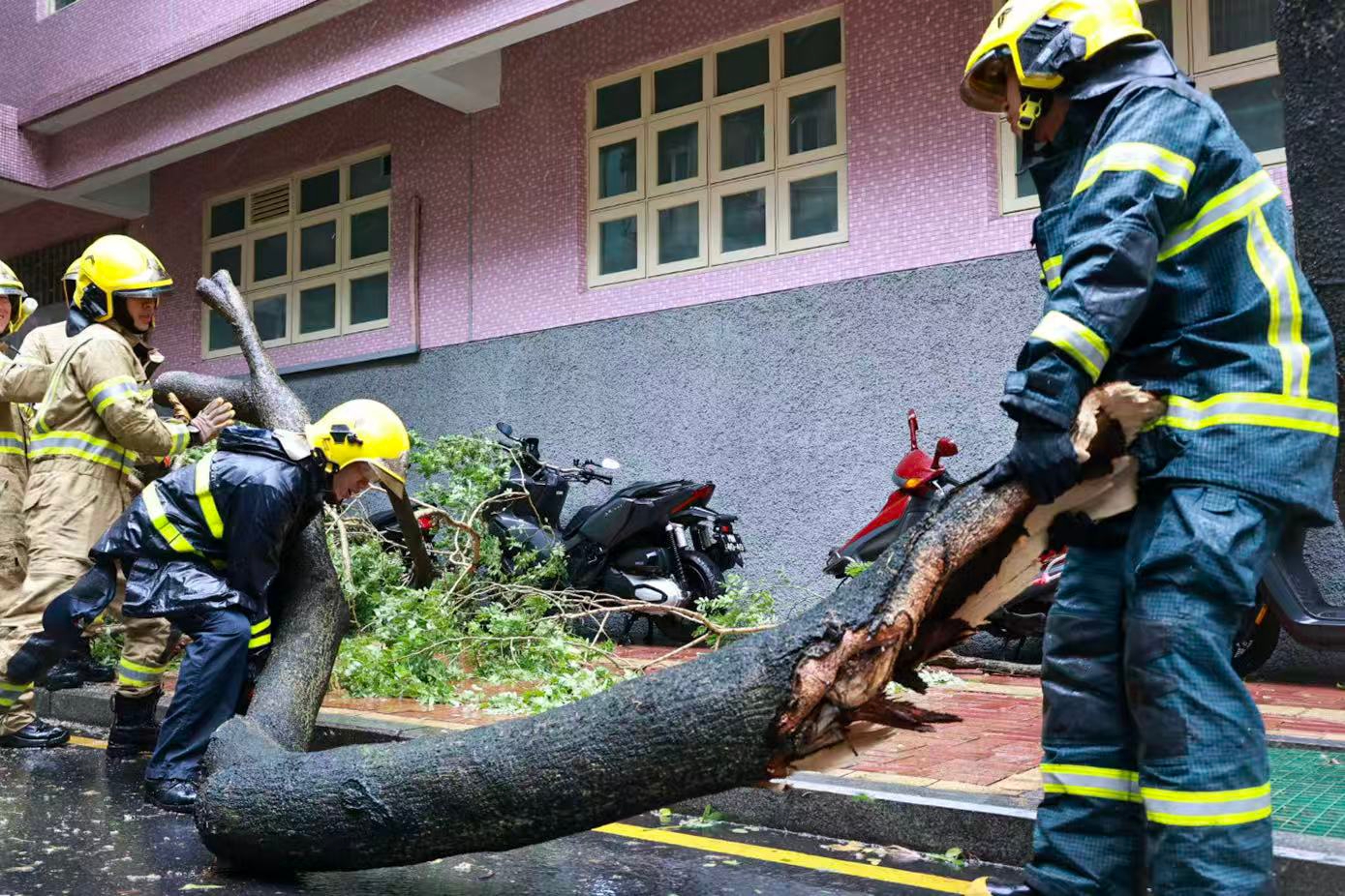 消防局人員緊急清理路面倒塌的樹木,恢復道路通行。