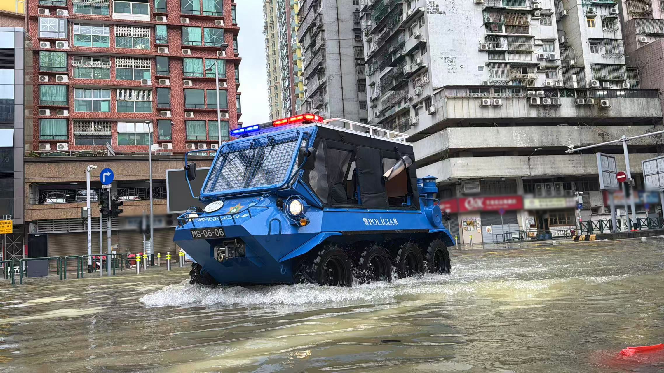 治安警察局人員出動水陸兩用車協助有需要的市民到達安全地點