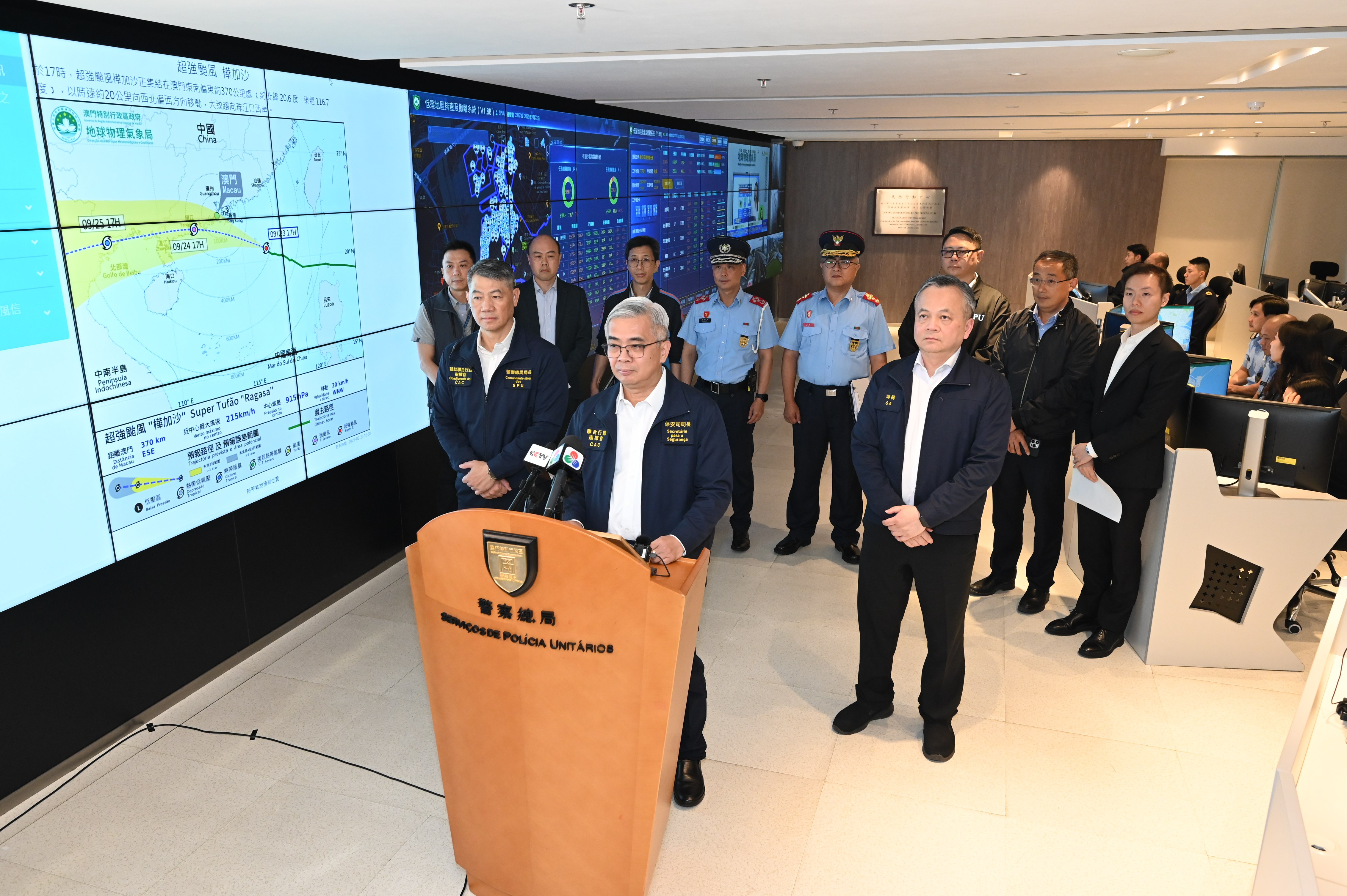 保安司司長、聯合行動指揮官黃少澤聯同民防架構成員代表發佈熱帶氣旋“樺加沙”的情況及應對工作部署