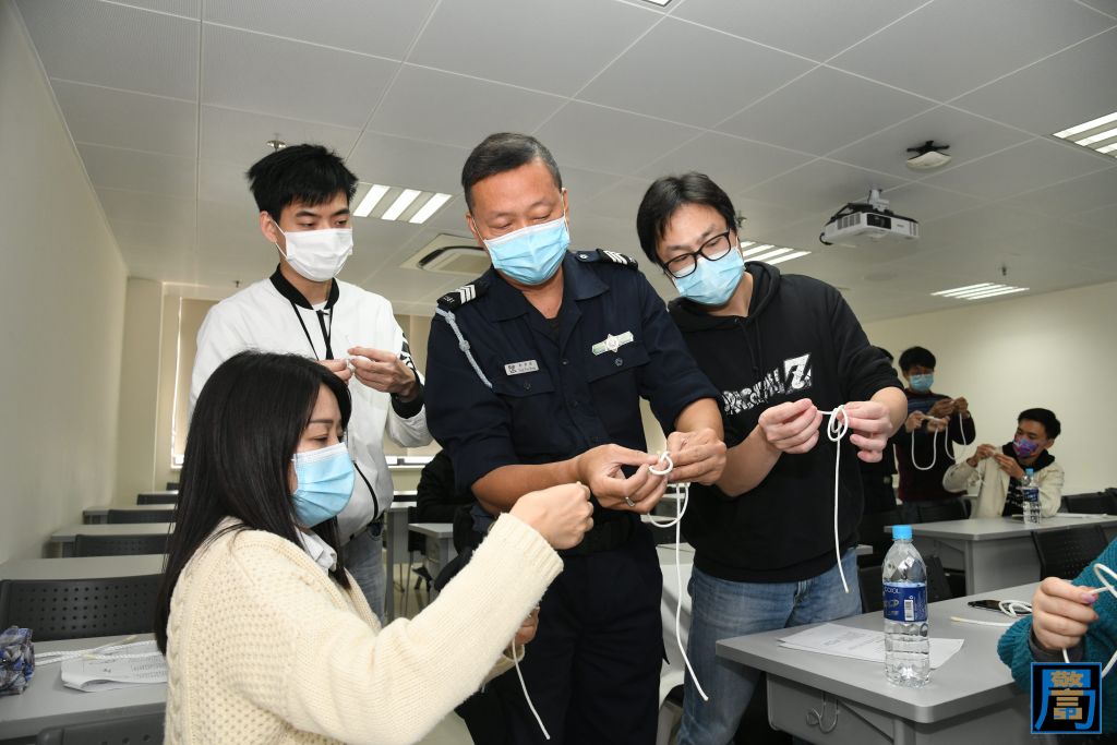 2月12日,“民防志願者”參與由澳門海關設計的《基礎繩結》課程,學習到日常生活中各式各樣繩結的用途、變化、技巧及應用方法。期望透過是次繩結課程,讓“民防志願者”能學以致用,以更好地輔助及支援民防工作。